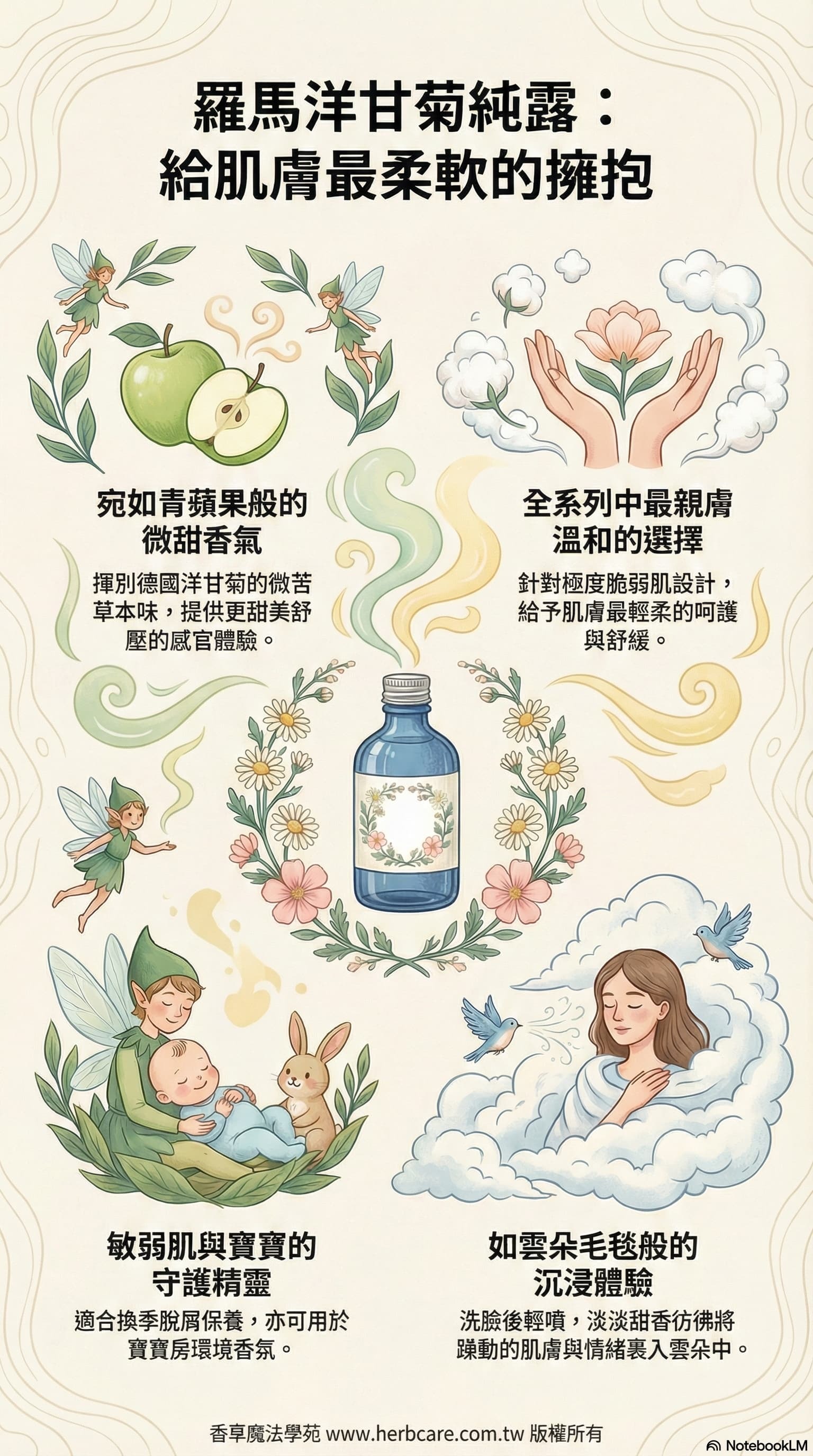 羅馬洋甘菊純露,是蒸餾羅馬洋甘菊精油時所產生的洋甘菊花水,眾所周知羅馬洋甘菊精油是最溫柔的美肌聖品,適合在肌膚鬧脾氣時如換季、曬後作為保養首選。本品無額外添加,含有微量的羅馬洋甘菊精油,富含鎮定成分,能舒緩肌膚敏感時的不適,為皮膚帶來舒爽感受。溫和的特性也很適合用於嬰幼兒、寵物空間噴灑擴香,或加於洗澡水中使用。
